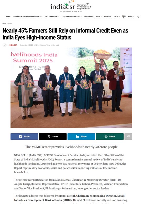 Speaking about the SOIL report, Vipin Sharma, CEO, ACCESS Development Services, said, “The SOIL Report makes it clear that while India is on a strong economic trajectory, with unemployment hovering around 6% and self-employment rising to nearly 58%, the quality of opportunities available to people remains uneven. The fact that almost 45% of farmers still depend on informal finance, and that women now make up over 64% of the agricultural workforce, reflects both the pressures and possibilities shaping the livelihoods landscape. As India moves toward the Viksit Bharat 2047 vision, our challenge and responsibility is to ensure that growth translates into secure, dignified, climate resilient livelihoods for every household. ACCESS remains committed to driving that transformation.”
