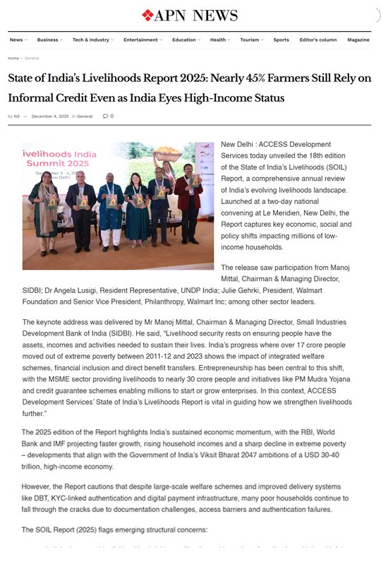 With the share of self-employment rising and the informal economy expanding, the Report also underscores the need for stronger livelihood security. While enablers like Kisan Credit Cards, microfinance, JAM, UPI and the Unified Lending Interface have expanded opportunities, many low-income households still lack dependable access to formal credit, relying instead on informal unemployment hovering around 6% and self-employment rising to nearly 58%, the quality of opportunities available to people remains uneven. The fact that almost 45% of farmers still depend on informal finance, and that women now make up over 64% of the agricultural workforce, reflects both the pressures and possibilities shaping the livelihoods landscape. As India moves toward the Viksit Bharat 2047 vision, our challenge and responsibility is to ensure that growth translates into secure, dignified, climate-resilient livelihoods for every household. ACCESS remains committed to driving that transformation.”
